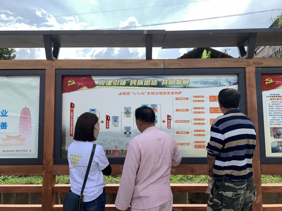 孙兴权作为党支部书记对帕连村的基层党建模式做了介绍。孙兴权书记指出,当前帕连村已经构建形成了“组组行动、户户参与、人人有责”的农村治理新格局,形成总支连支部、支部连小组、小组连党员、党员连农户的联动机制。为解决村民小组管理力量薄弱、人少事多的问题,帕连村村民小组在党委的领导下,探索构建“1+1+N”农村末梢治理体系。第一个1即建强一个村民小组党组织;第二个1即组建一个村民自我管理自我治理小组,简称“村民自管组”;N即健全N个群众组织,形成“支部到组、自管到户、商量到人”的治理格局。
