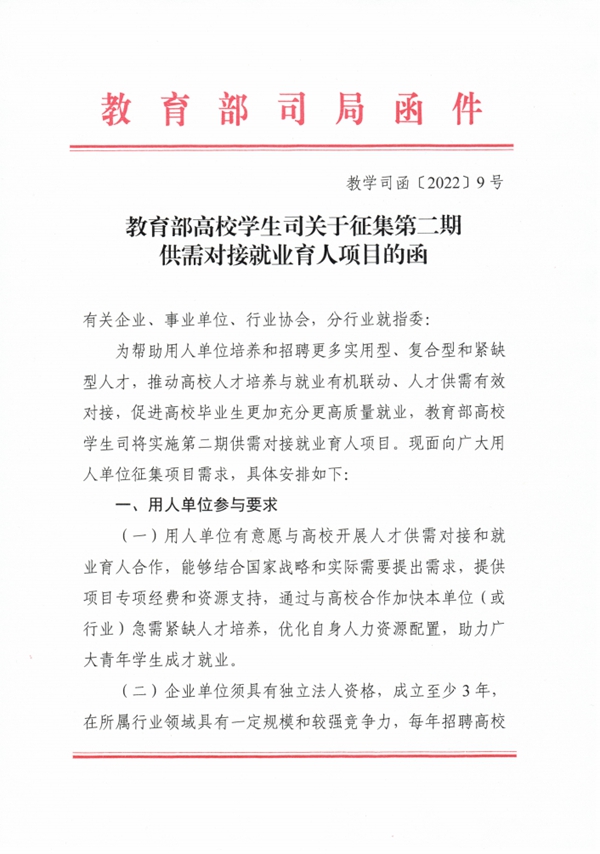 教育部高校员工司关于征集第二期供需对接就业育人项目的函