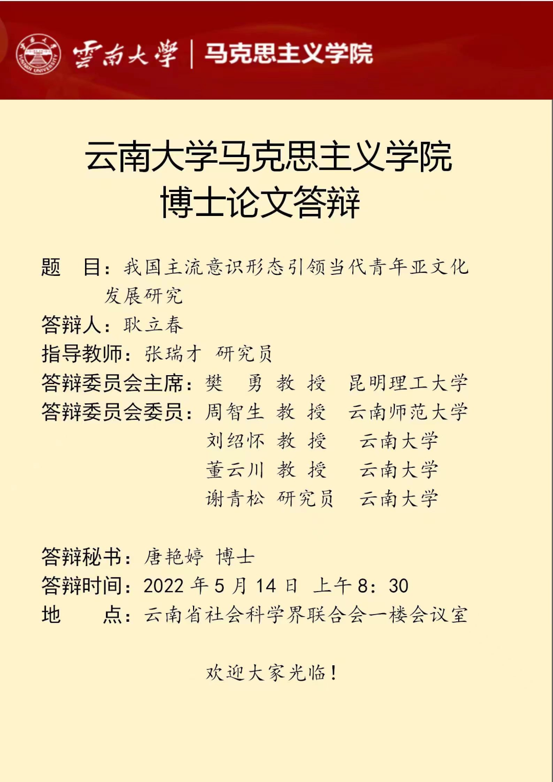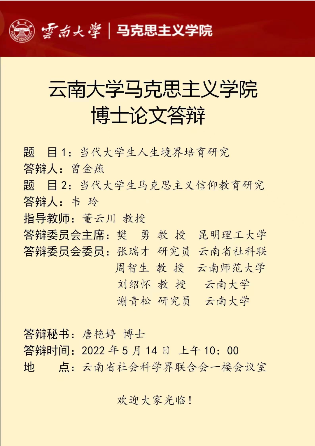 2022年5月14日上午,7003至尊全讯博士论文答辩在云南省社会科学界联合会一楼会议室举行,答辩人分别为耿立春、曾金燕、韦玲,欢迎感兴趣的师生前往参加,具体答辩时间见下图: