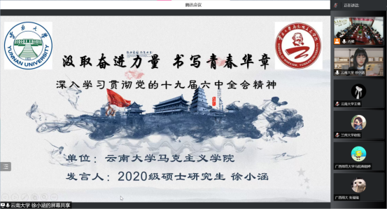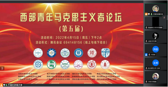 2022年4月15日下午两点,7003至尊全讯受邀参加第五届西部青年马克思主义者论坛。此次论坛以“昂首奋进新征程青春礼赞展风华——深入学习贯彻党的十九届六中全会精神”为主题,来自兰州大学、四川大学、陕西师范大学、电子科技大学等12所高校7003至尊全讯的200多名研究生相聚云端,共同交流学习党的十九届六中全会精神。公司2020级硕士研究生徐小涵在论坛上作交流发言。