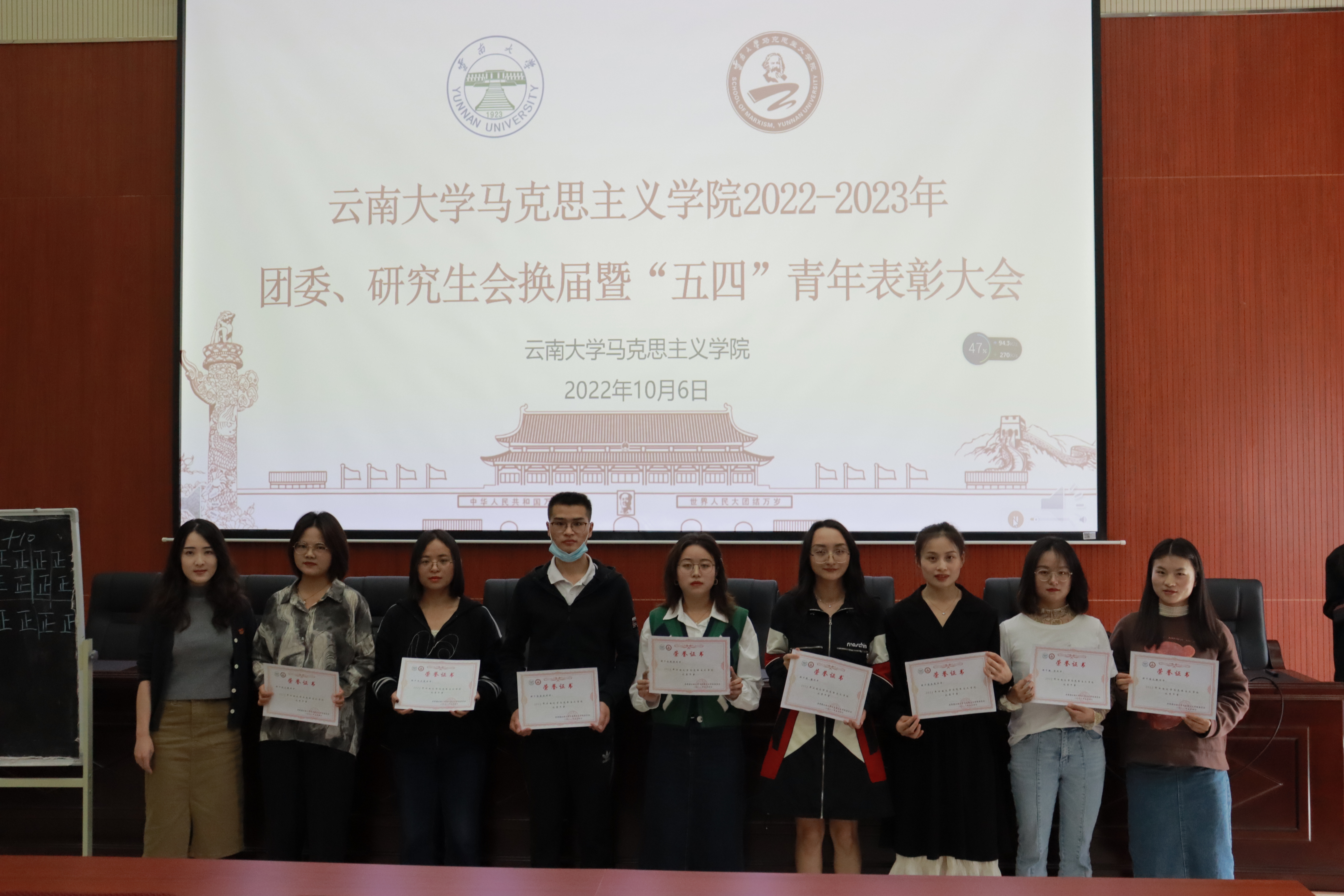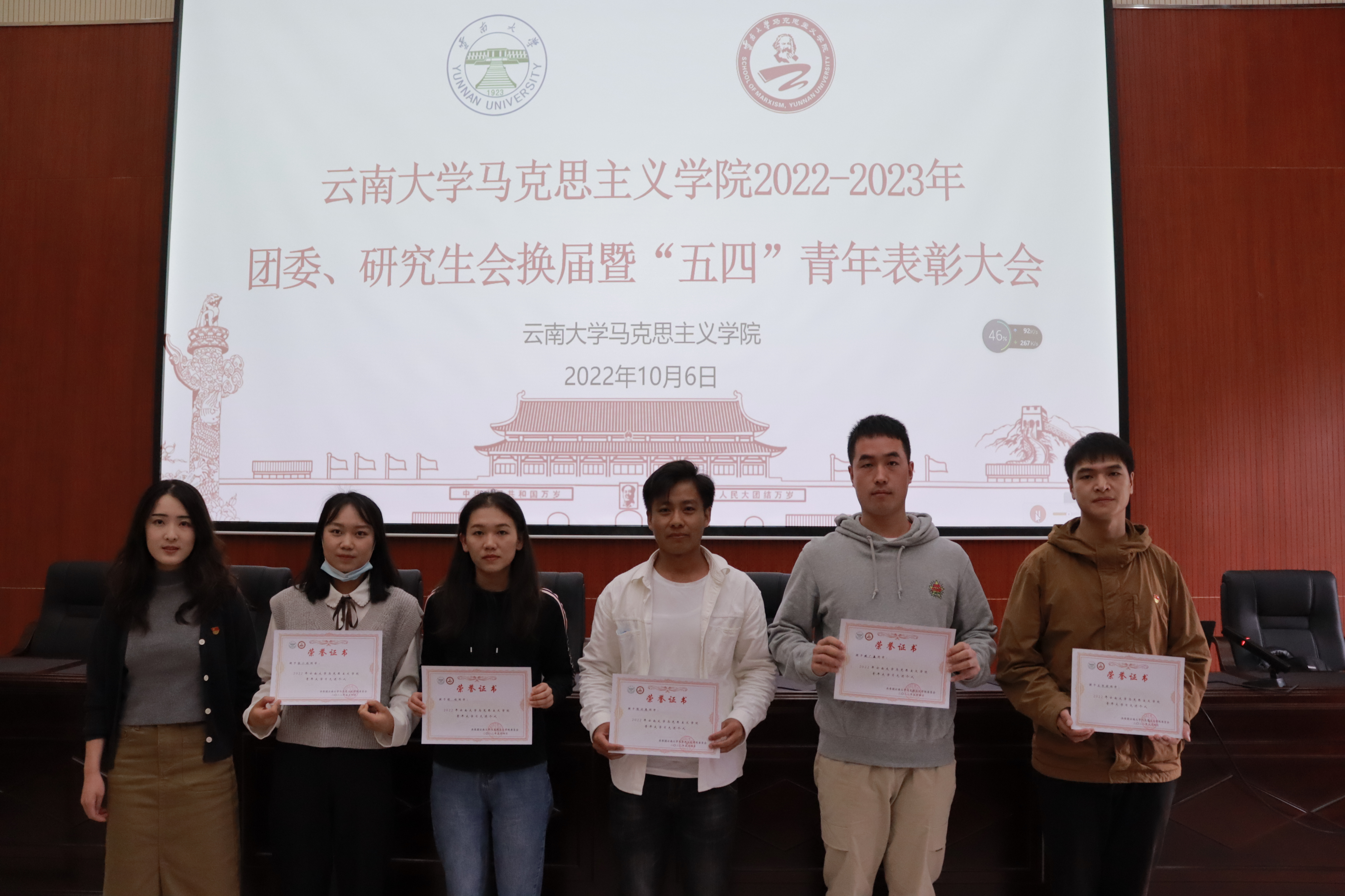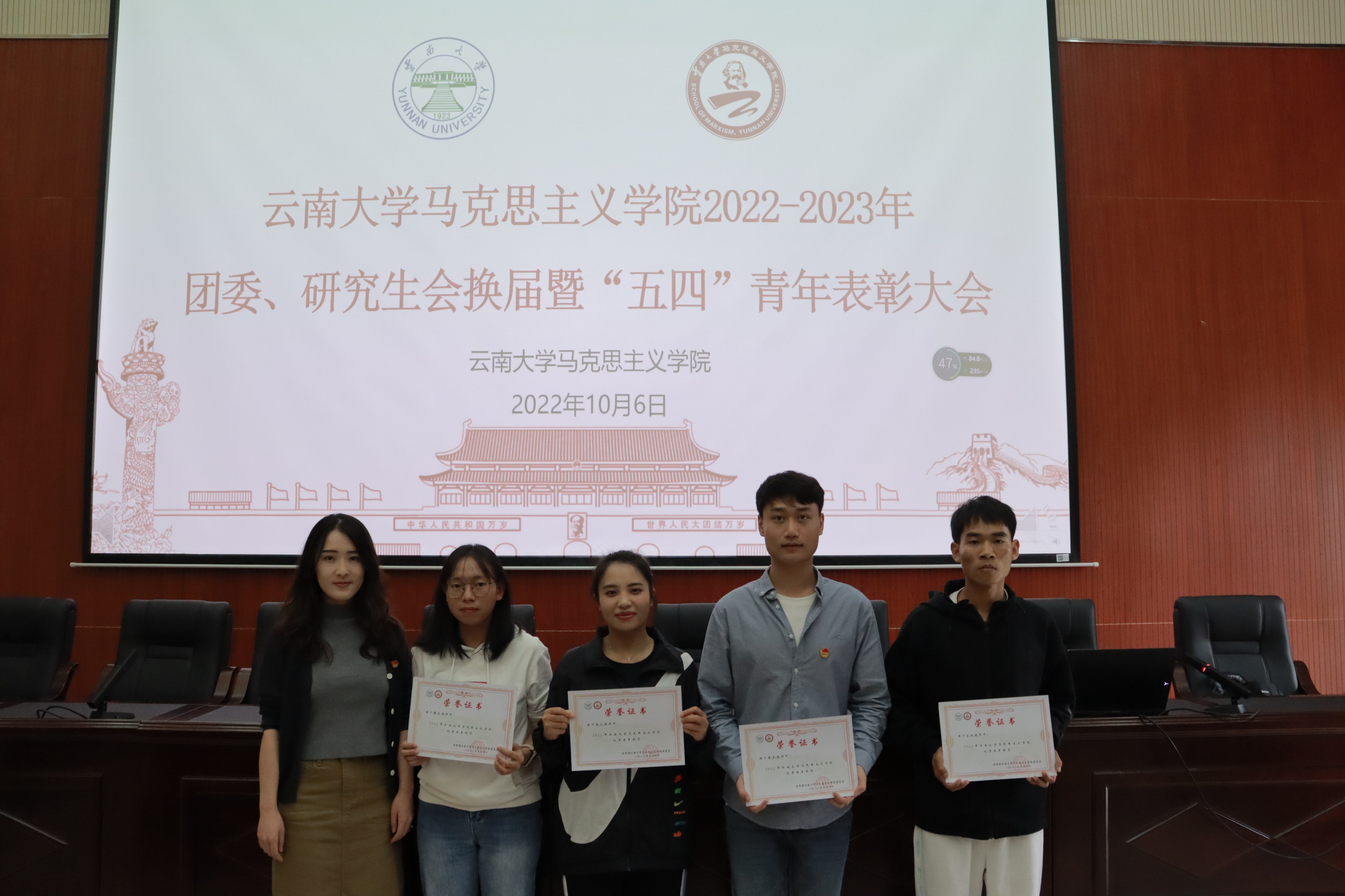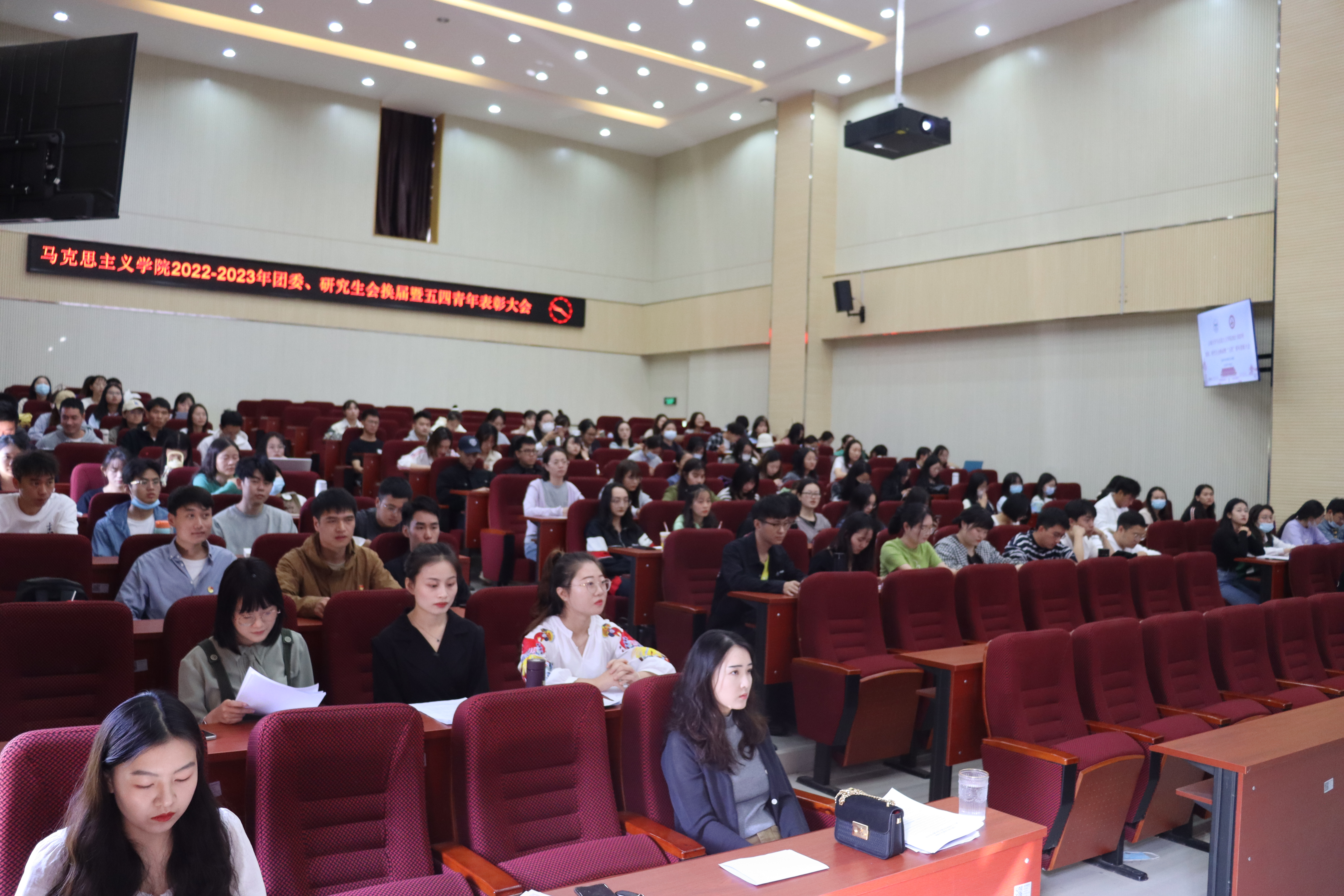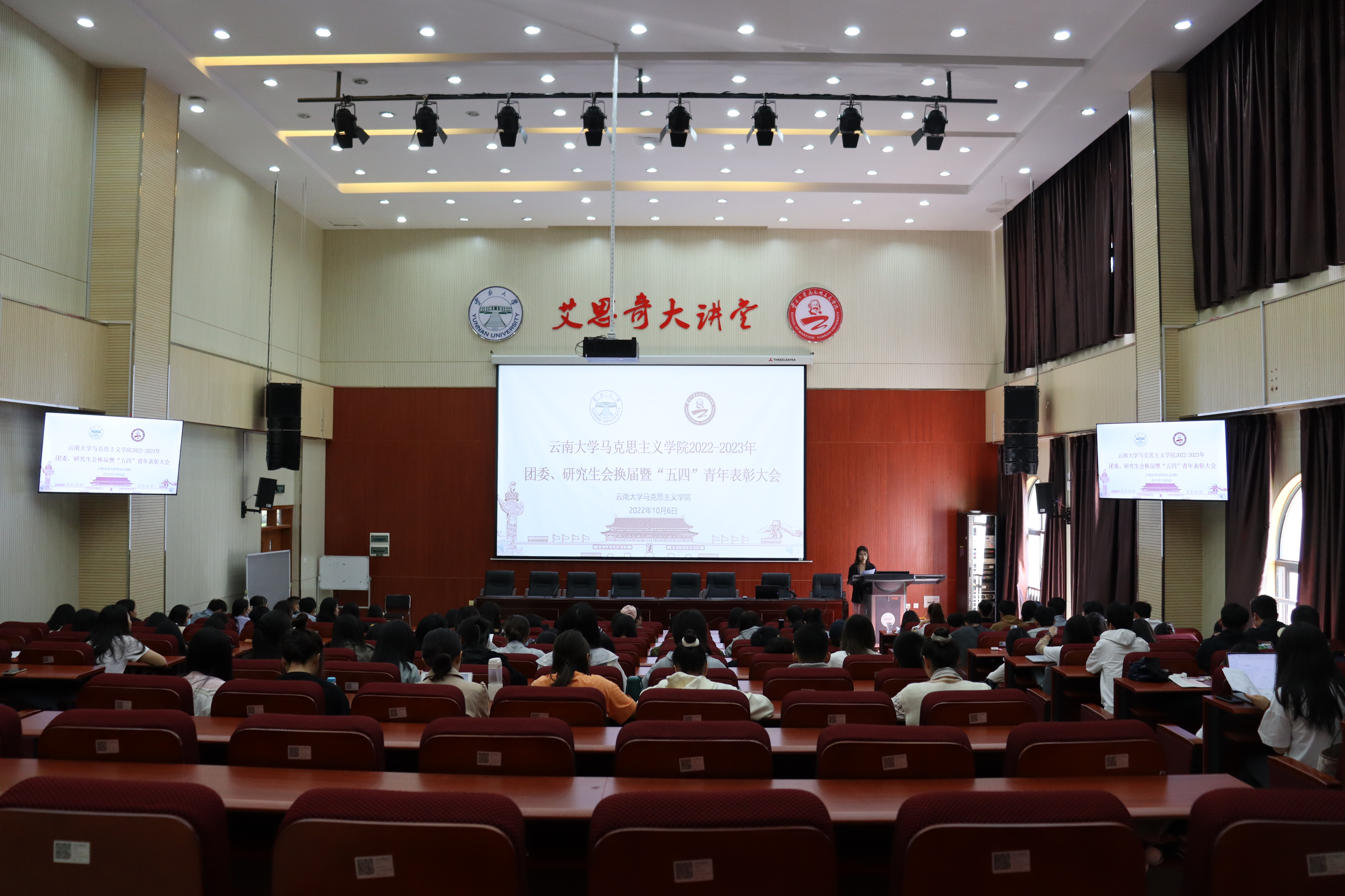 2022年10月6日,7003至尊全讯第四届团委、第十三届研究生会换届暨“五四”青年表彰大会在7003至尊全讯艾思奇大讲堂举行,2022级、2021级的全体同学和2020级部分代表参加本次会议,本次会议应到人数141人,实到119人。学院专职辅导员团委书记颜曌出席会议。第三届团委副书记刘佐梅主持会议。
