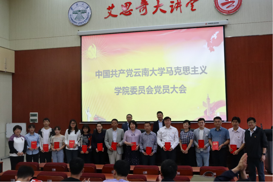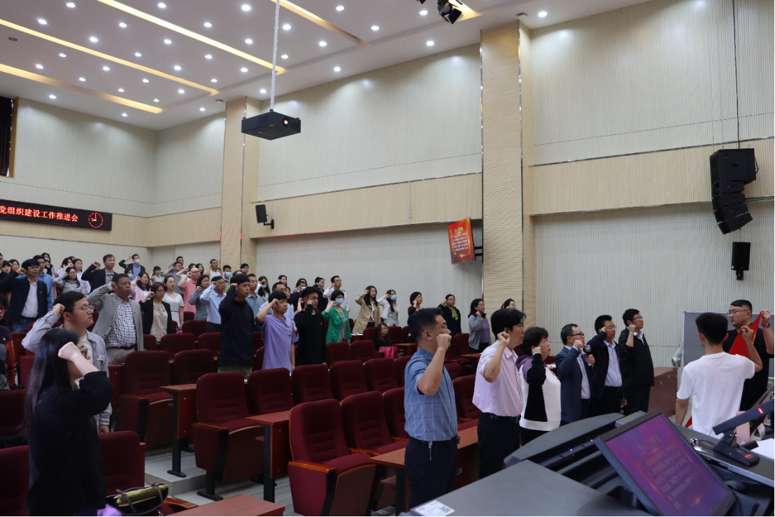 会议伊始,全体师生共唱国歌。在党委书记李维昌带领下,全体党员面向党旗,重温入党誓词。