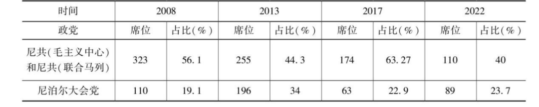 表3 2008年以来尼共(毛主义中心)和尼共(联合马列)与尼泊尔大会党在大选中所获席位比较